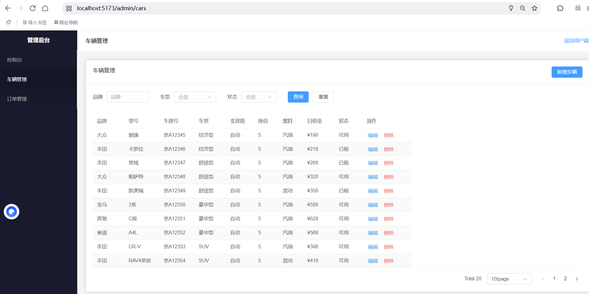 | 车辆管理 | 车辆列表(分页、按品牌/车型/状态筛选),新增、编辑、删除车辆 |