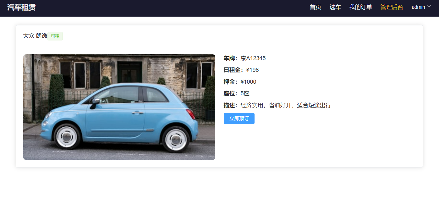 | 车辆详情 | 查看车辆信息、日租金、描述等,支持选择租期并下单 |