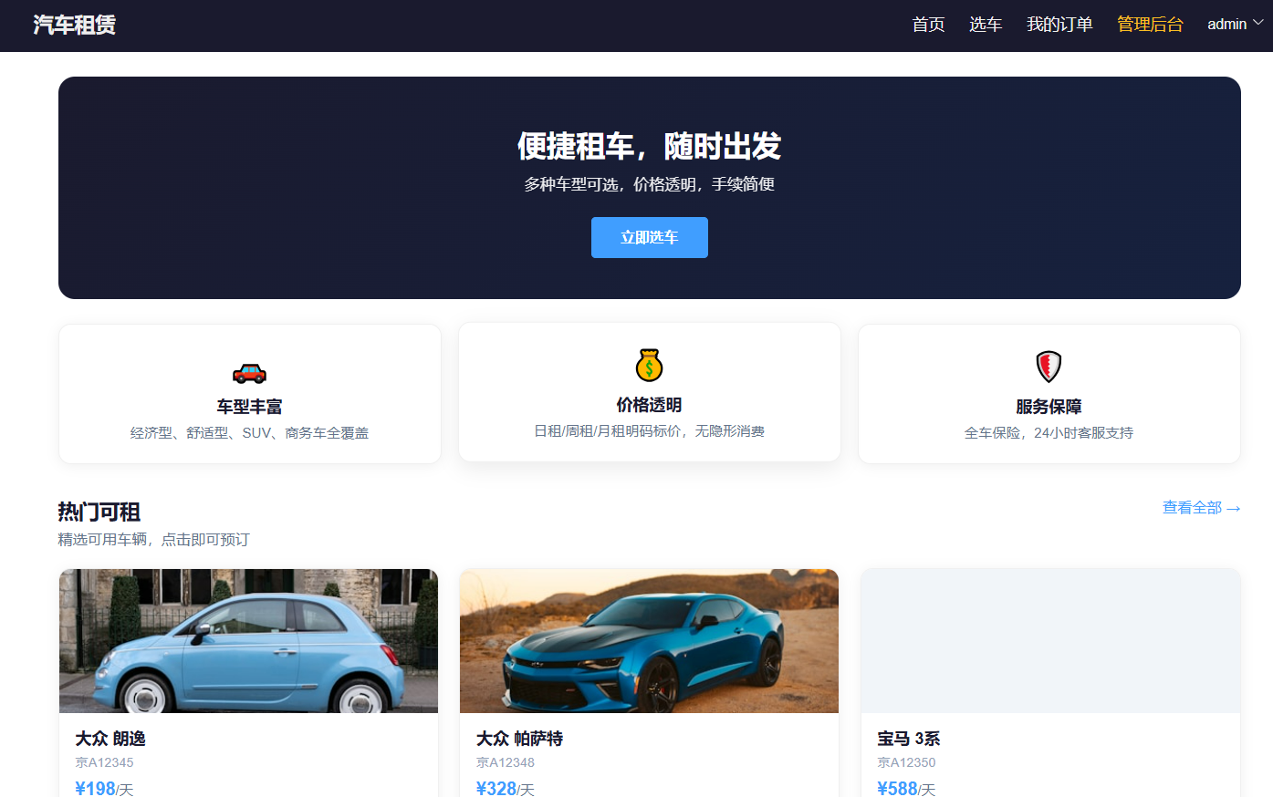 前后端分离的汽车租赁管理系统,包含用户端 (选车、下单、订单管理)与管理后台(统计、车辆管理、订单管理)。