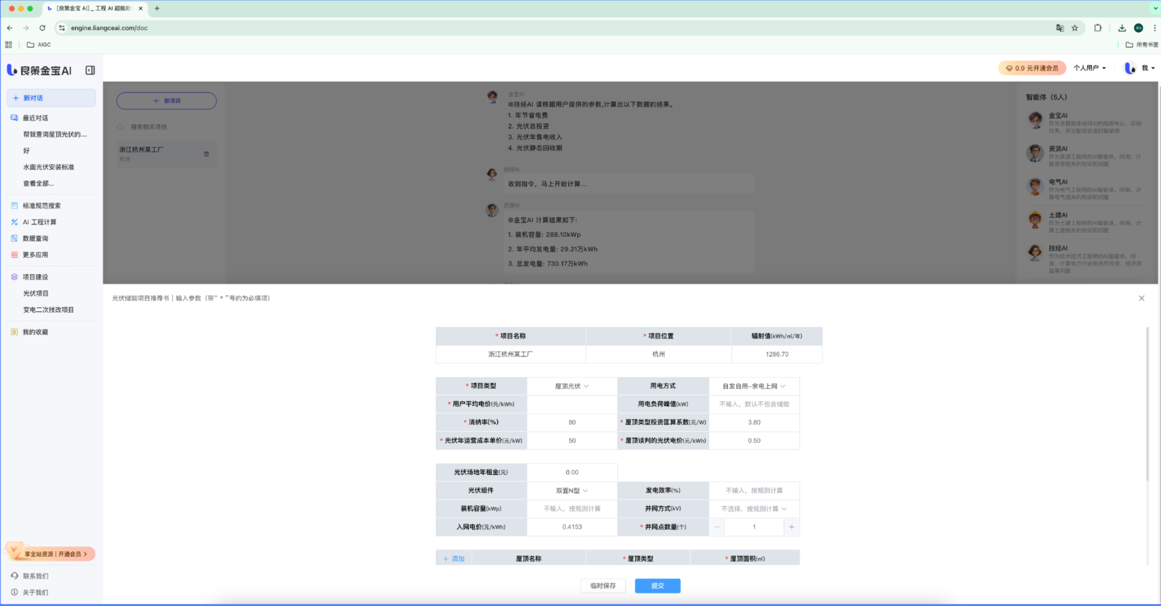用户在结构化表单中填写:装机容量(或面积)、电价类型、自发自用比例等核心字段。
