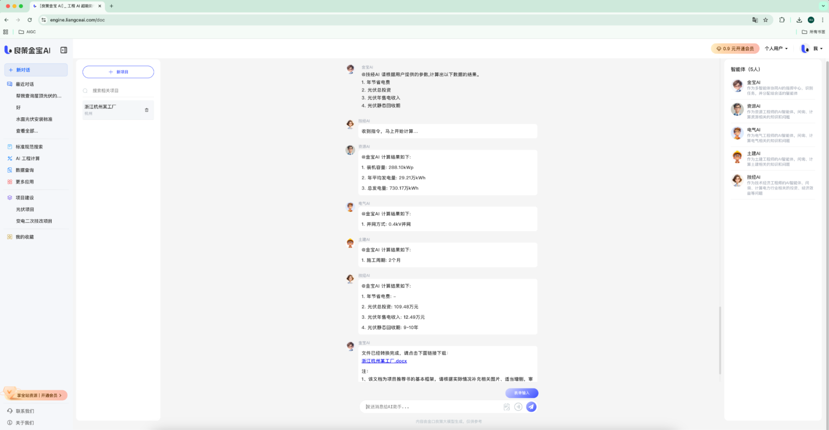 系统随即自动调度多智能体协同工作:"电气 AI"完成阵列排布与发电量模拟 → "技经 AI"计算节省电费、投资回收期 → "土建 AI"评估施工可行性 → 所有结果汇总 → 自动生成 标准格式 Word 建议书