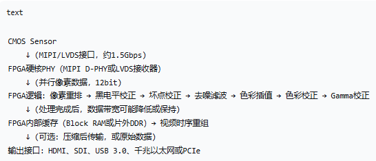 - FPGA(现场可编程门阵列) :承担所有像素级实时处理任务 ,包括Sensor配置、时序生成、去噪、色彩校正、格式转换等。FPGA的并行流水线架构可确保1080p60视频的零延迟处理(处理延迟<1行时间)。