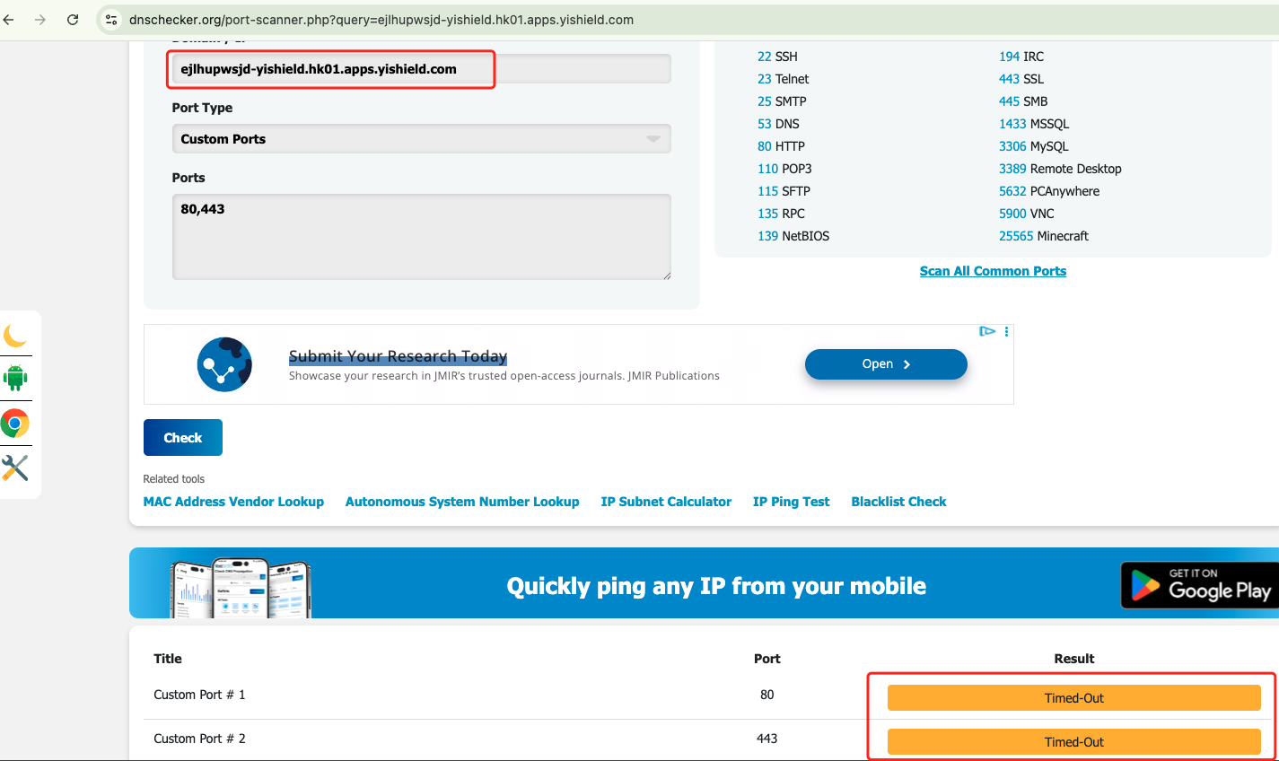 隐身性:我们对分配的专属域名进行扫描,会发现。其 443与80端口是 Time out 的