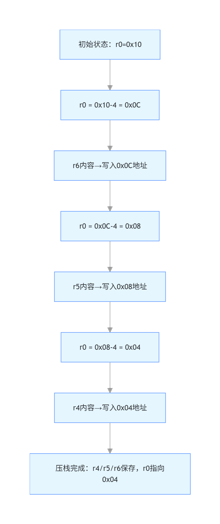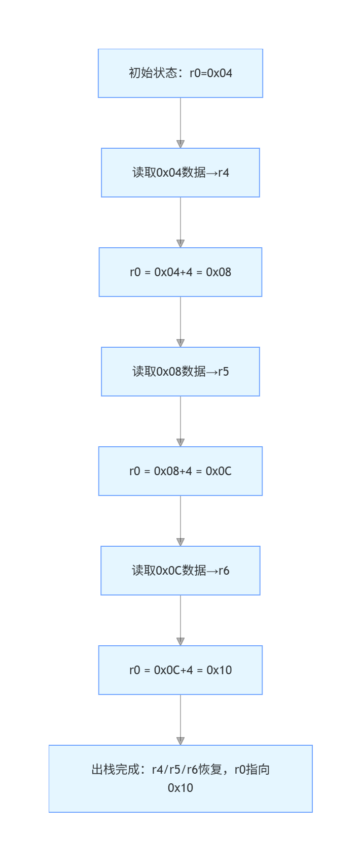 R1, #4\]:基址 + 偏移寻址,计算有效地址为 R1 + 4。 ### 1.2 写内存:Store 用于将寄存器中的数据写入内存。 STR R0, [R1, #4] ; 把 R0 的4字节数据写入地址 R1+4 STR:Store Register,存储寄存器。 与 LDR 相反,实现寄存器到内存的数据回写。 ### 1.3 加减运算 用于寄存器间的算术操作,是任务调度、地址计算的基础。 ADD R0, R1, R2 ; R0 = R1 + R2 ADD R0, R0, #1 ; R0 = R0 + 1 SUB R0, R1, R2 ; R0 = R1 - R2 SUB R0, R0, #1 ; R0 = R0 - 1 ### 1.4 比较指令 用于比较两个寄存器的值,结果保存在 PSR(程序状态寄存器)中,为后续条件跳转提供依据。 CMP R0, R1 ; 比较 R0 和 R1,结果更新到PSR 1.5 跳转指令 用于程序流控制,是函数调用、任务切换的核心。 B main ; Branch,直接跳转到 main 标签处 BL main ; Branch and Link,先将返回地址存入LR寄存器,再跳转到 main ## 二、堆与栈的核心概念 堆(Heap)和栈(Stack)是处理器中两种核心的内存分配方式,二者的地址生长方向、操作逻辑差异显著,直接影响程序的内存布局和执行效率。 ### 2.1、堆,栈的概念 注意:我们经常 "堆栈" 混合着说,其实它们不是同一个东西: 堆(heap)就是一块空闲的内存,需要提供管理函数。 malloc:从堆里划出一块空间给程序使用。 free:用完后,再把它标记为 "空闲" 的,可以再次使用。 栈(stack)函数调用时局部变量保存在栈中,当前程序的环境也是保存在栈中。 可以从堆中分配一块空间用作栈。 ### 2.1、堆和栈的地址生长方向  堆(Heap):生长方向向上,即内存地址从低到高扩展。 堆是开发者通过malloc()/free()手动管理的内存区域,分配时从低地址开始,每次申请新内存都会向高地址方向延伸。 栈(Stack):生长方向向下,即内存地址从高到低收缩。 栈是系统自动管理的内存区域(用于存储函数参数、局部变量、寄存器现场),每次压栈操作都会占用更低的内存地址。 不同处理器的堆栈生长方向差异 | 处理器 / 架构 | 堆栈生长方向 | 核心逻辑(以 PUSH 指令为例) | |------------|----------|---------------------------------------------------------| | 51 单片机 | 正向生长(向上) | 执行`PUSH`时,先将栈指针`SP+1`,再将数据入栈 | | 80x86 微机 | 逆向生长(向下) | 执行`PUSH`时,先将栈指针`SP-2`,再将 16 位数据入栈(小端模式:高字节存高地址,低字节存低地址) | | STM32(ARM) | 逆向生长(向下) | 执行压栈指令时,栈指针`SP`先递减,再存储数据;出栈时先读取数据,再递增`SP` | > 补充知识点:C 语言函数参数传递遵循 "从右向左入栈" 规则,因此函数最左侧的参数会最后入栈、最先出栈。 ## 三、出栈 / 压栈汇编指令详解(以 STM32 的 ARM 汇编为例) STM32 基于 ARM 架构,常用`ldmia`(出栈 / 加载)、`stmdb`(压栈 / 存储)指令完成寄存器现场的保存与恢复,以下结合流程图和具体地址示例拆解执行逻辑。 ### 3.1 出栈(恢复现场):从低地址→高地址 出栈指令用于将栈中保存的寄存器值恢复到 CPU 寄存器中,地址方向为**从下往上(低地址→高地址)**。  核心指令:ldmia r0!, {r4-r6} 执行示例(假设初始r0=0x04): 将r0指向的地址0x04中的内容加载到r4,随后r0 = r0 + 4 = 0x08; 将r0指向的地址0x08中的内容加载到r5,随后r0 = r0 + 4 = 0x0C; 将r0指向的地址0x0C中的内容加载到r6,随后r0 = r0 + 4 = 0x10; 最终效果:栈中低地址的数据依次恢复到r4→r5→r6,栈指针r0向高地址移动。 ### 3.2、压栈(保存现场):从高地址→低地址 压栈指令用于将 CPU 寄存器的值保存到栈中,地址方向为**从上往下(高地址→低地址)**。  核心指令:stmdb r0!, {r4-r6} 执行示例(假设初始r0=0x10): 先将r0 = r0 - 4 = 0x0C,再将r6的内容存储到r0指向的地址0x0C; 再将r0 = r0 - 4 = 0x08,再将r5的内容存储到r0指向的地址0x08; 最后将r0 = r0 - 4 = 0x04,再将r4的内容存储到r0指向的地址0x04; 最终效果:r4→r5→r6的内容依次保存到栈的低地址区域,栈指针r0向低地址移动。 *** ** * ** *** ## 总结 本期博客从堆栈的地址生长方向入手,详解了压栈 / 出栈汇编指令的执行逻辑。