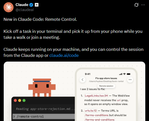 今天早上起来,看到 Claude Code 正式上线了 Remote Control 功能。