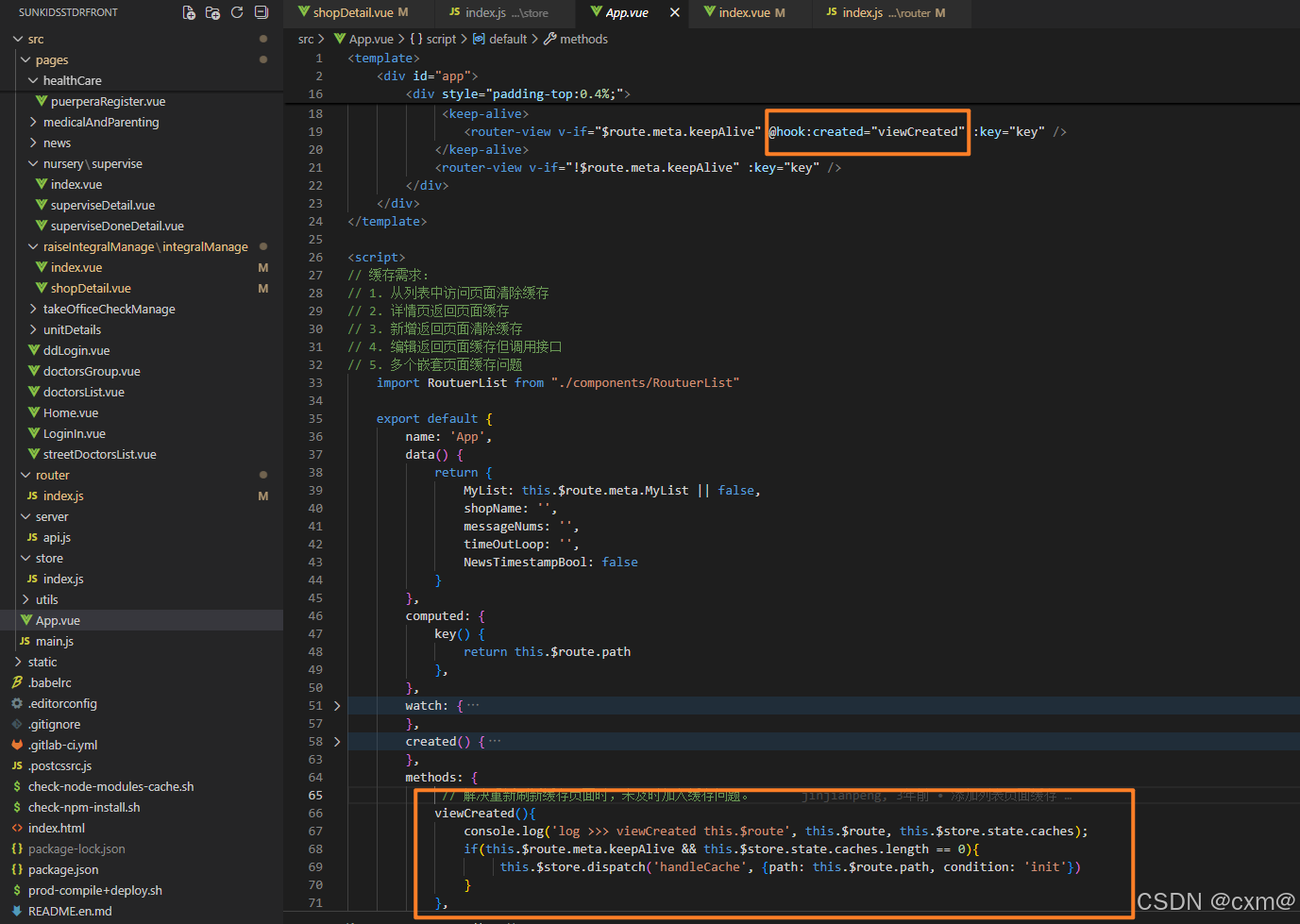 4,当重新刷新缓存页面,或者跳转其他页面之后在回到当前页面之后,没有及时加入缓存的问题,在上面keep-alive包裹的router-view触发hook回调函数,监听组件的生命周期created,