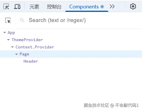 Header 组件通过 useContext 获取主题和切换函数,并展示当前主题: