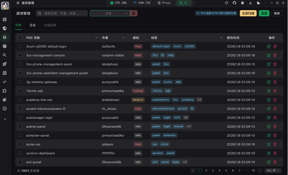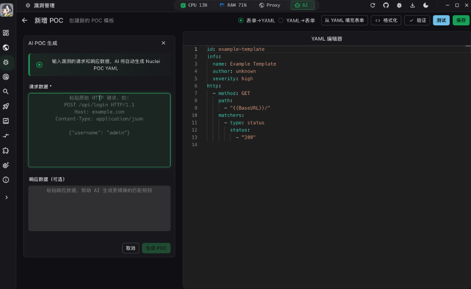 | 漏洞扫描 | 基于 Nuclei 引擎,支持 POC 管理、批量扫描、请求包可视化、一键生成验证图片 |