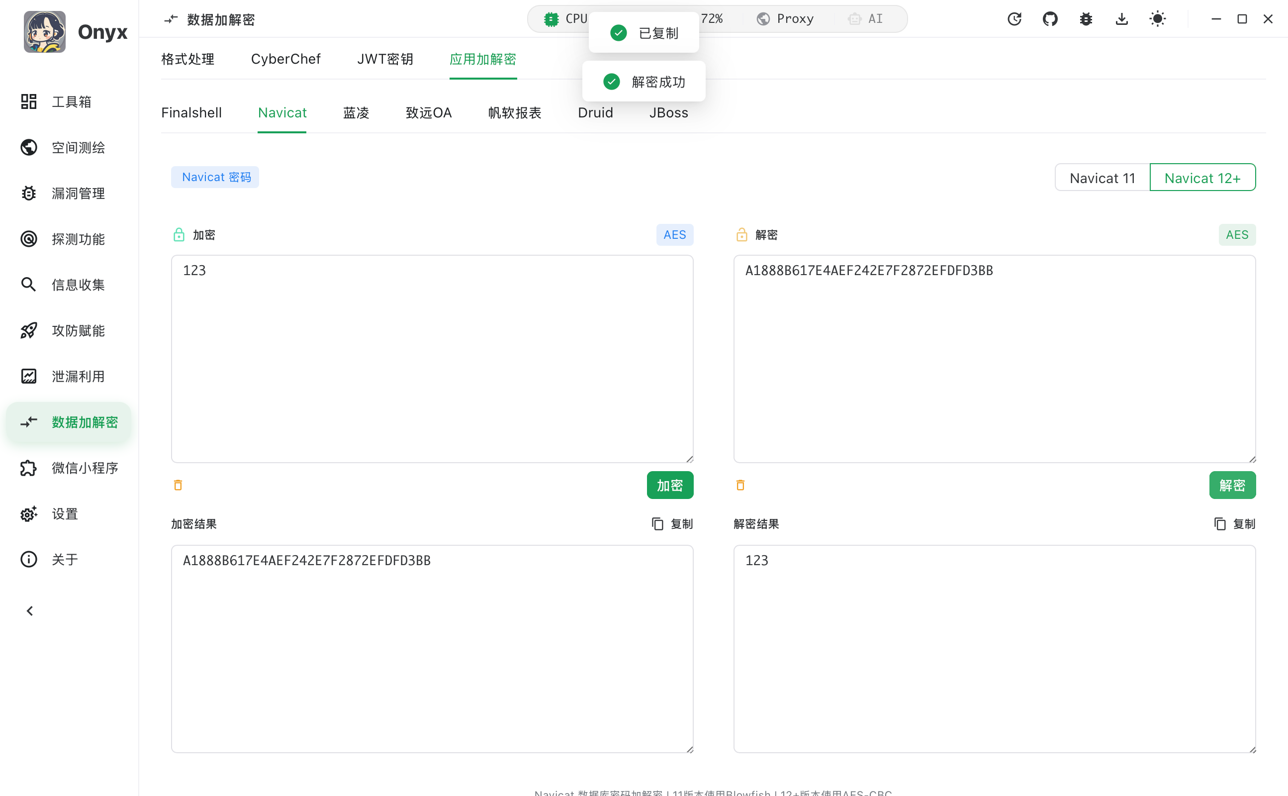 | 应用加解密 | 提供 FinalShell 、Navicat 、蓝凌 、致远 、帆软 、Druid 、JBoss 等常见应用/中间件的加解密工具 |