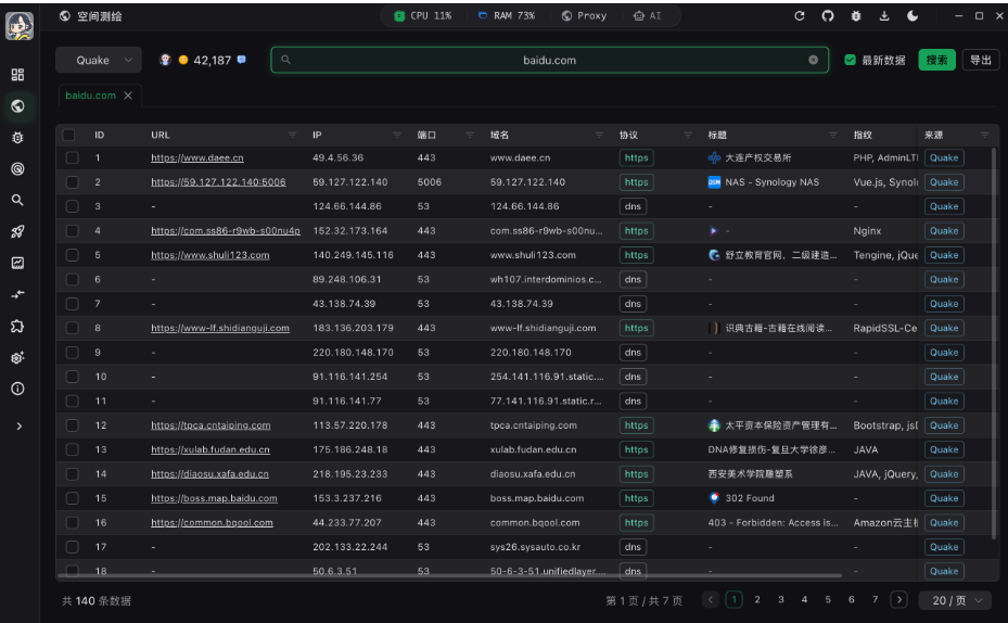 | 空间测绘 | 集成 Fofa 、Hunter 、Quake 三大测绘引擎,支持批量资产导出 |