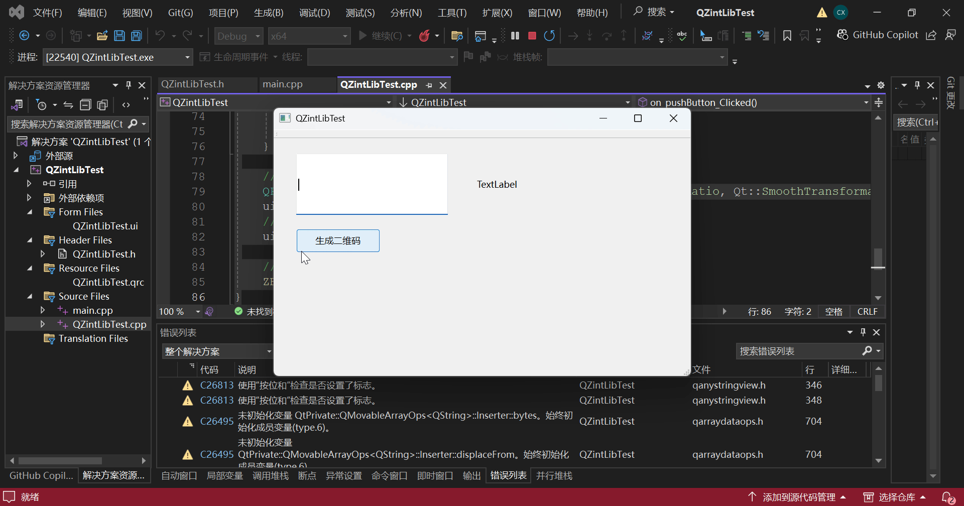 于是改用VS2022创建Qt项目,然后然后添加相关的库,就能调用Zint库中的函数生成二维码了。