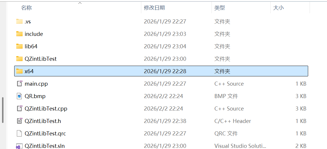 先把Zint源码中的include文件夹、lib文件夹、复制到项目目录下、Zint.dll、libpng16.dll放到运行目录下,如下图: