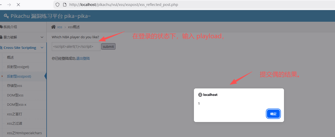 此过程和 get 的 xss 操作基本一致,主要区别在于参数的携带方式。