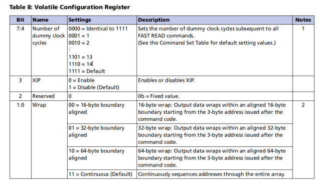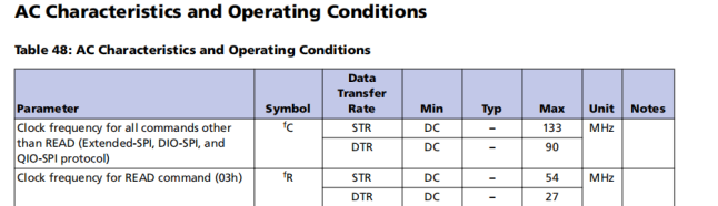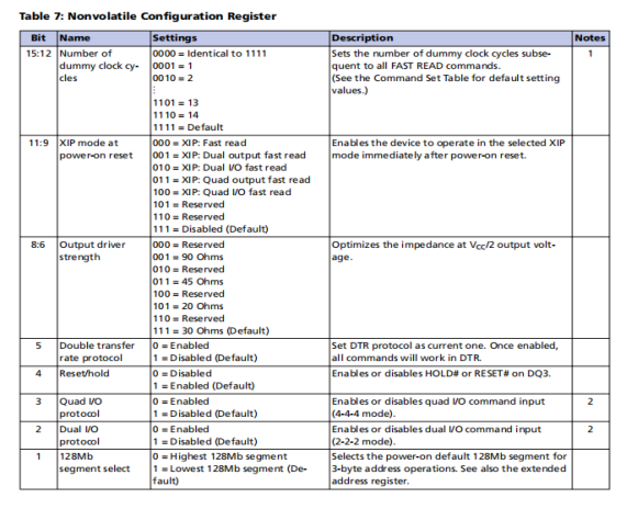 根据下表,结合在Command Definitions中的FAST READ command code和Note5得知,flash芯片出厂默认的Dummy cycles为8,FAST READ最快速率达到133MHz。在Command Definitions的Note5中得知,nonvolatile configuration register 和 volatile configuration register可以修改dummy clock 周期数。