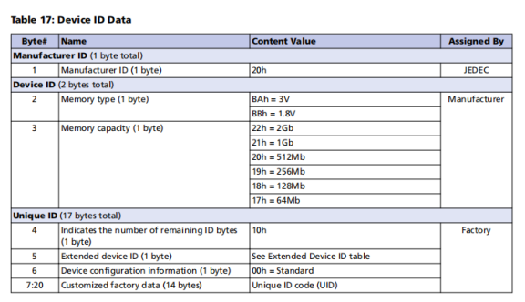 下图为Device ID Data tables,由表可知可读取的ID信息最大为20 bytes。我们一般只需读取前3个byte来确定Device ID。