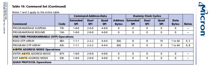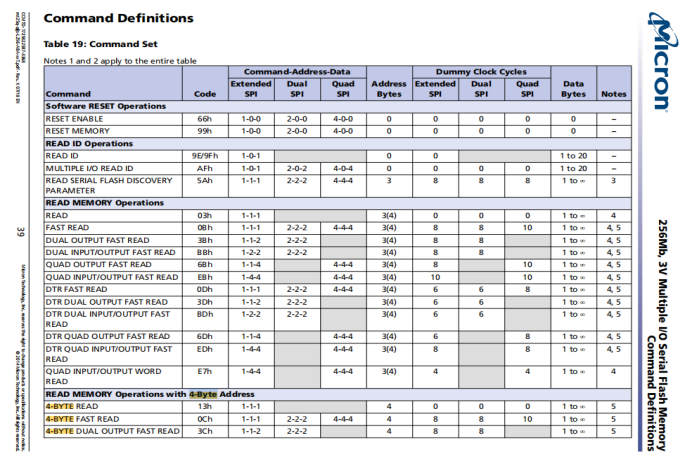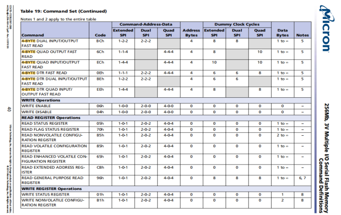 2.command code会根据standard, dual, or quad协议分别在 DQn = 1、2 或 4 的几条线上进行传输。然而,一个command也可能不受协议限制地在多条 DQn 线上同时传输address and data。协议列显示了指令使用多少条 DQn 线来传输command、address and data,如以下示例所示:command - address - data = 1 - 1 - 1,或 1 - 2 - 2,或 2 - 4 - 4,等等。