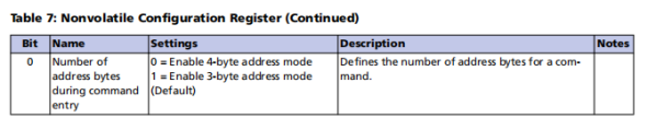 | 0 | Addressing | 0 = 3-byte addressing 1 = 4-byte addressing | Status bit:指示启用3-byte address mode还是4-byte address mode。 |