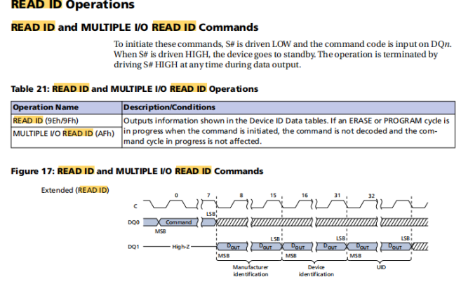 输出为Device ID Data tables中的信息,如果命令启动时正在进行ERASE或PROGRAM周期,则该命令不被解码,也不影响正在进行的命令周期。