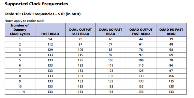 1.周期数必须设置为与时钟频率一致,时钟频率根据FAST READ命令的类型而不同(See Supported Clock Frequencies table)。工作频率的dummy clock周期不足会导致内存读取错误数据。