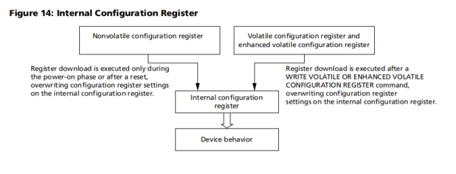 这个寄存器读写分别通过READ VOLATILE CONFIGURATION REGISTER and the WRITE VOLATILE CONFIGURATION REGISTER commands,在这些命令之后执行寄存器下载,覆盖决定设备内存行为的internal configuration register配置。