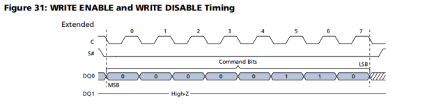 | WRITE ENABLE(06h) | 在每个PROGRAM, ERASE和WRITE命令之前设置 Write enable latch bit。 |