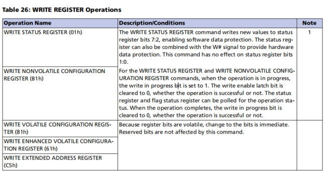 在执行WRITE REGISTER命令之前,必须执行WRITE ENABLE命令将write enable latch bit设置为1。为发起命令,需要驱动s#低并保持低,直到最后一个data字节的第8位被锁存,之后它必须被驱动为高;对于WRITE NONVOLATILE CONFIGURATION REGISTER命令,s#保持低电平,直到最后一个data字节的第16位被锁存。对于extended spi、dual spi和quad spi协议,输入分别在DQ0, DQ[1:0], and DQ[3:0]上,后面跟随data bytes。如果s#没有被驱动为HIGH,则命令不执行,flag status register error bits不设置,并且Write enable latch保持为1。该操作是自定时的,WRITE STATUS REGISTER的操作持续时间为 tW,WRITE NONVOLATILE CONFIGURATION REGISTER的操作持续时间为 tNVCR。