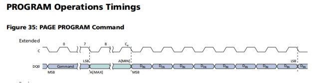 | PAGE PROGRAM (02h) | 当操作正在进行时,write in progress bit置为1。无论操作是否成功,write enable latch bit都被清除为0。The status register and flag status register能够查询当前操作状态。当操作完成后,write in progress bit被清除为0。可以使用PROGRAM/ERASE SUSPEND或PROGRAM/ERASE RESUME命令暂停或恢复操作。 如果最末位地址(即起始地址)的各bit并非全为零,那么超出当前page范围的所有传输数据都将从本page的起始地址进行编程。如果发送到设备的字节数超过最大page大小,则先前存储的数据将被丢弃,而本page内仅保证最后最大页page大小数量的数据字节能够正确编程。如果发送到设备的字节数少于最大page大小,则它们将在指定地址正确编程,而不会对本page的其他字节产生任何影响。 |