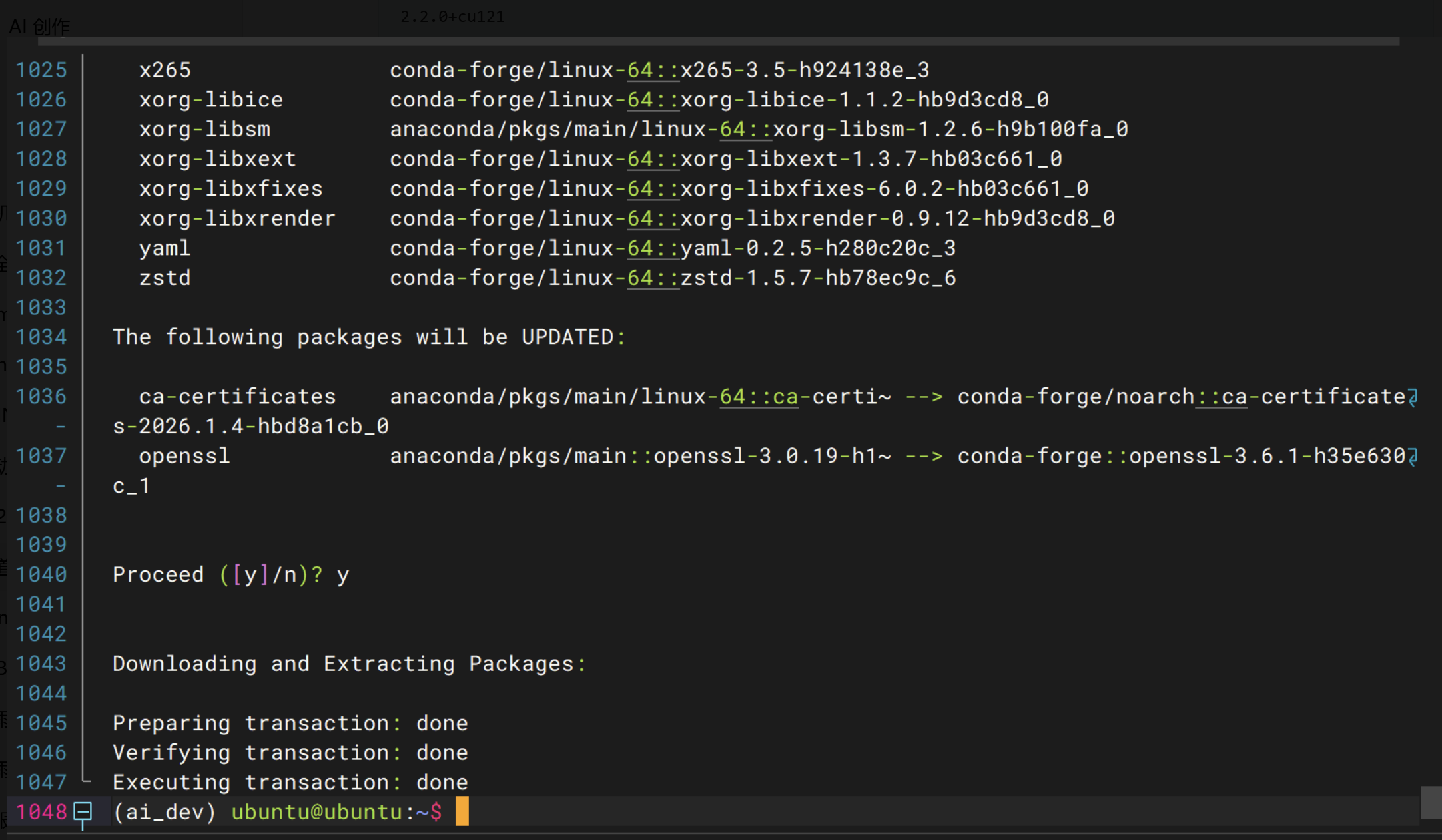 在 ai_dev 环境中执行以下命令,检查 PyTorch 和 CUDA 是否可用: