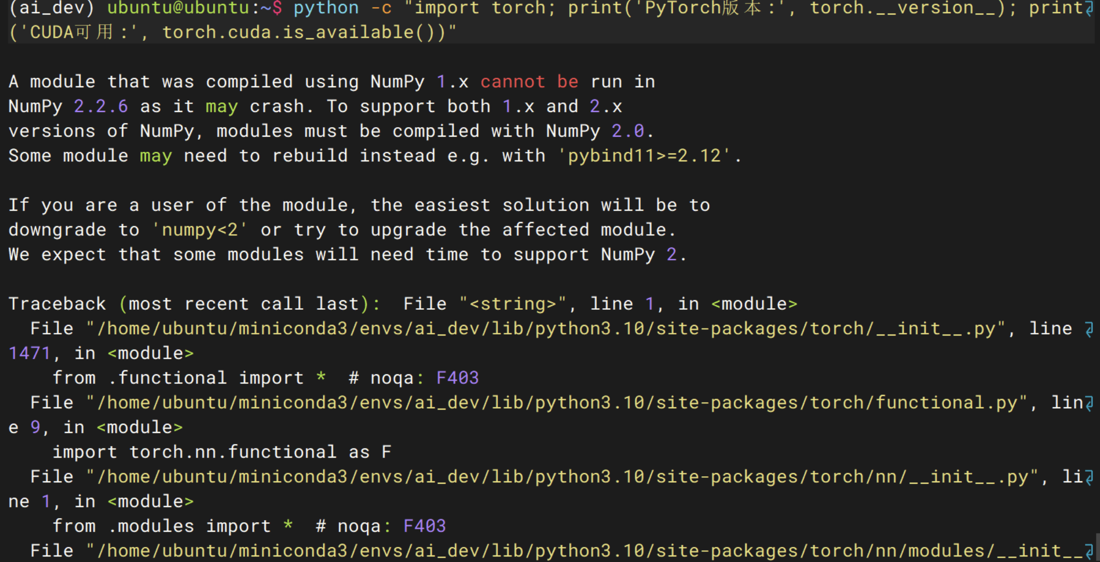执行以下命令,检查 NumPy 版本和 PyTorch 初始化是否正常: