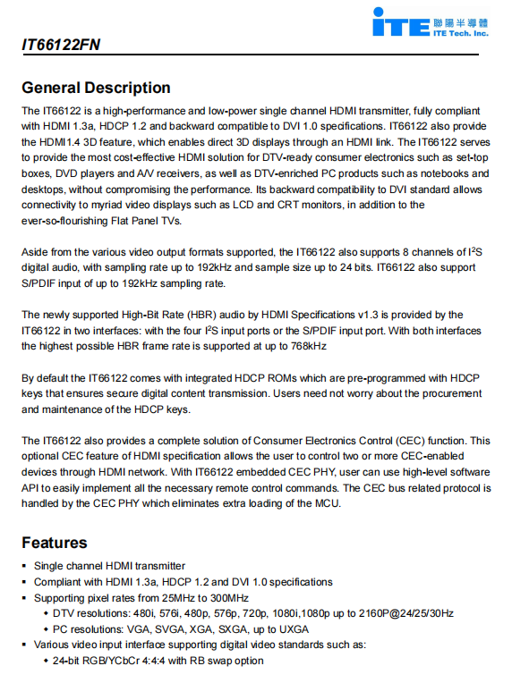 IT66122 以 "低功耗 + 高集成 + 兼容性" 为核心优势,单芯片集成视频编码、音视频同步、内容保护等功能,外围电路极简,支持多种数字视频输入格式与音频接口,可直接替代 IT66121,无需修改 PCB 设计,大幅降低方案升级成本。