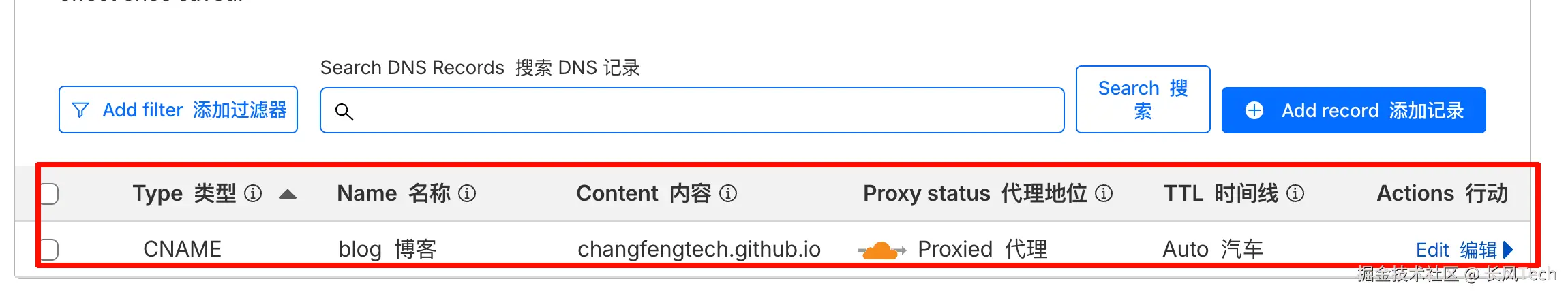 同样的方式,再点击添加记录,记录类型选择CNAME,主机记录我用的是blog的子域名,所以填blog,大家可以根据自己的需求自行填写。记录值写原来的Github Pages的默认域名,即用户名.github.io,我这里写的是changfengtech.github.io。