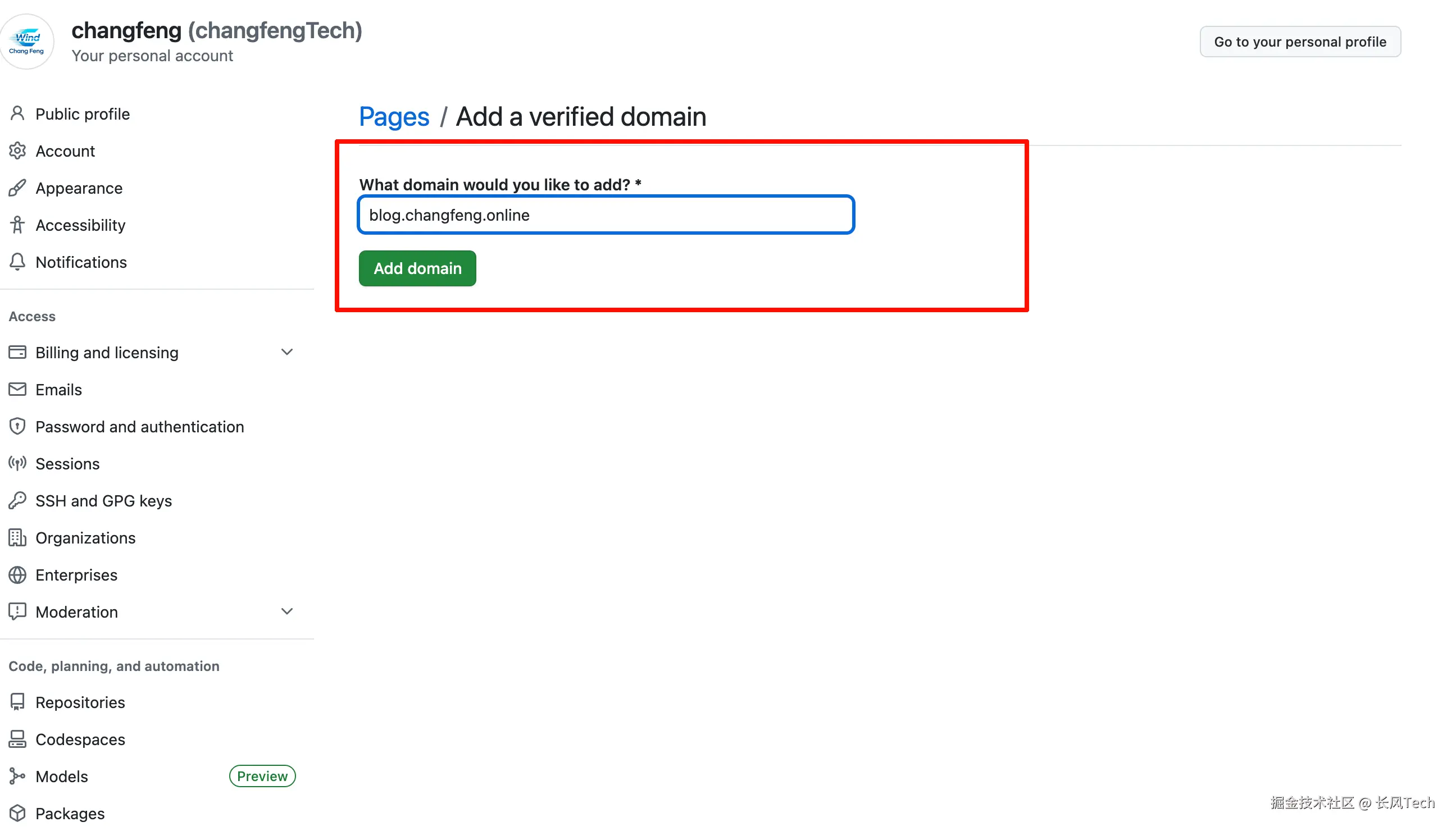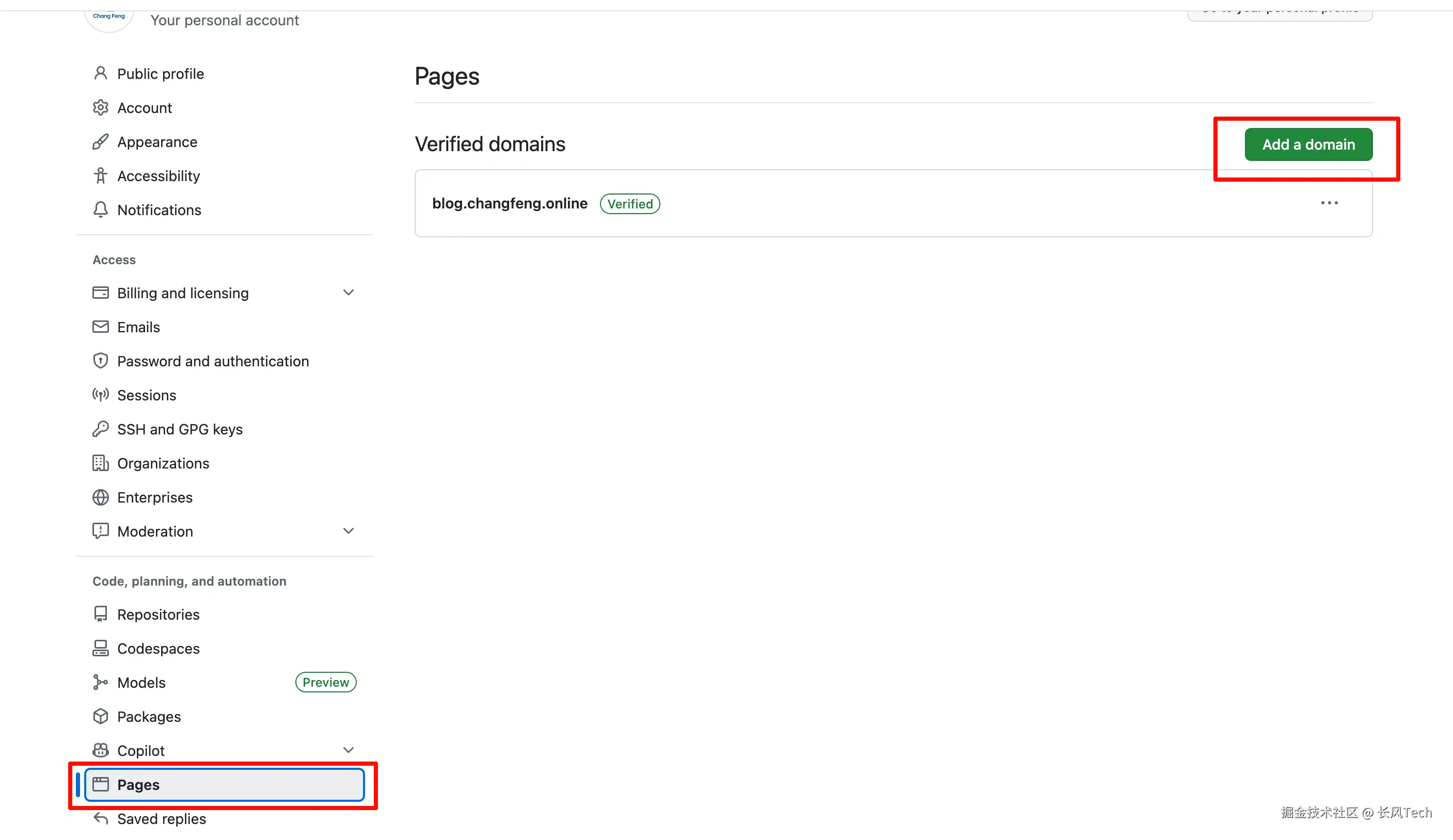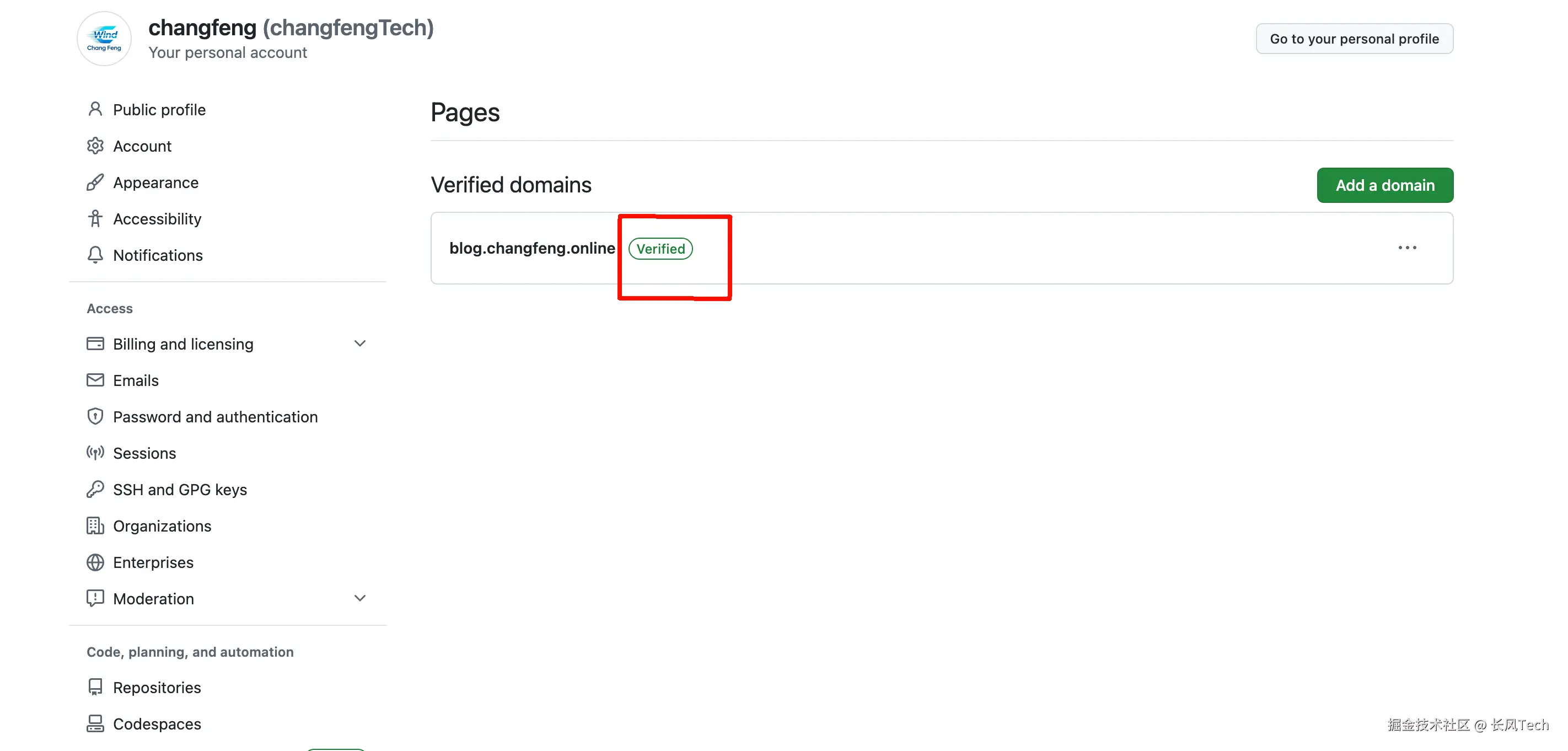 首先,我们需要在Github上,证明该域名属于我们所有。设置路径是github首页-头像-Settings-Pages-Add a domain