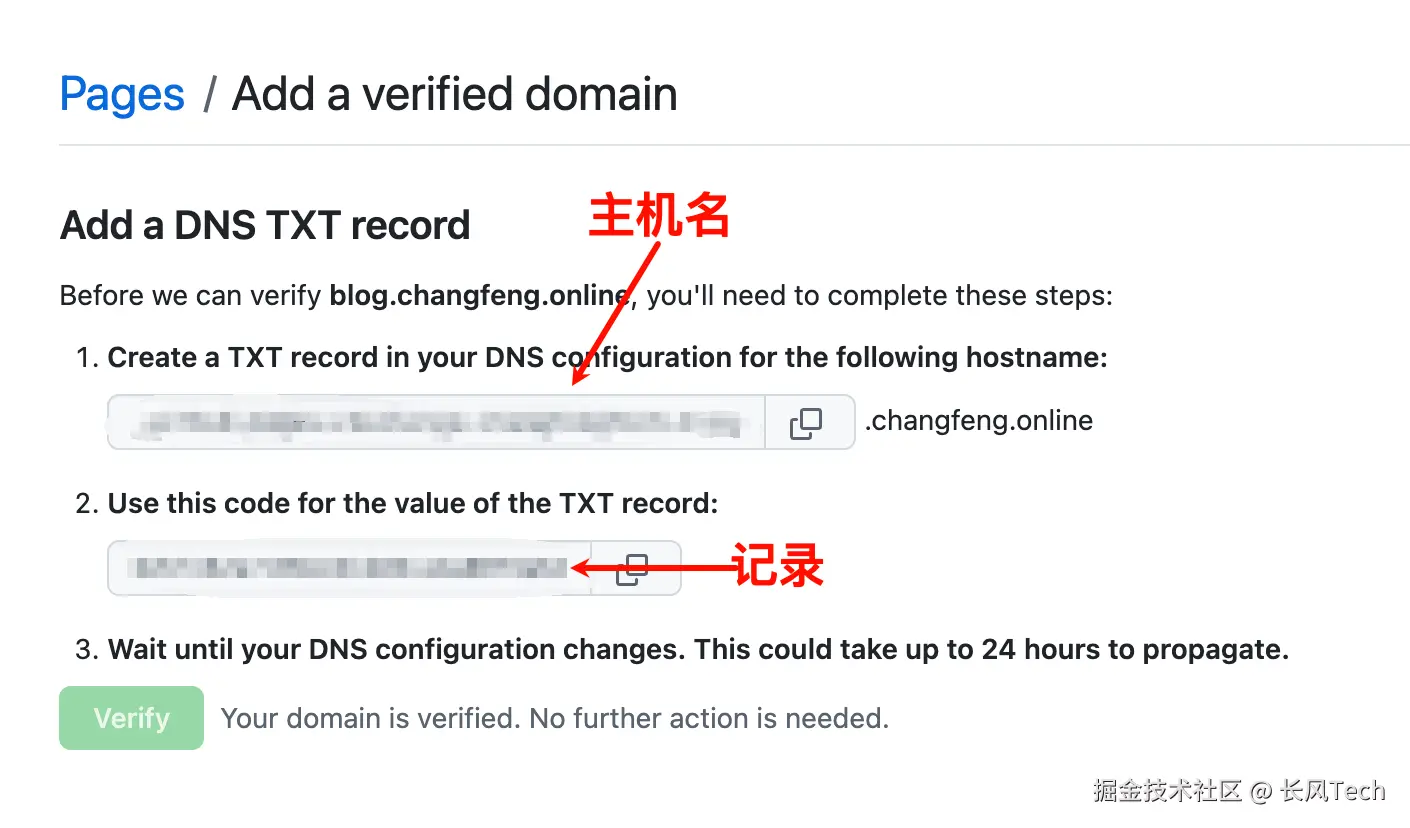 ⚠️ 注意:第一次是验证域名所有权(账号级),第二次是为某个仓库绑定域名(仓库级)。