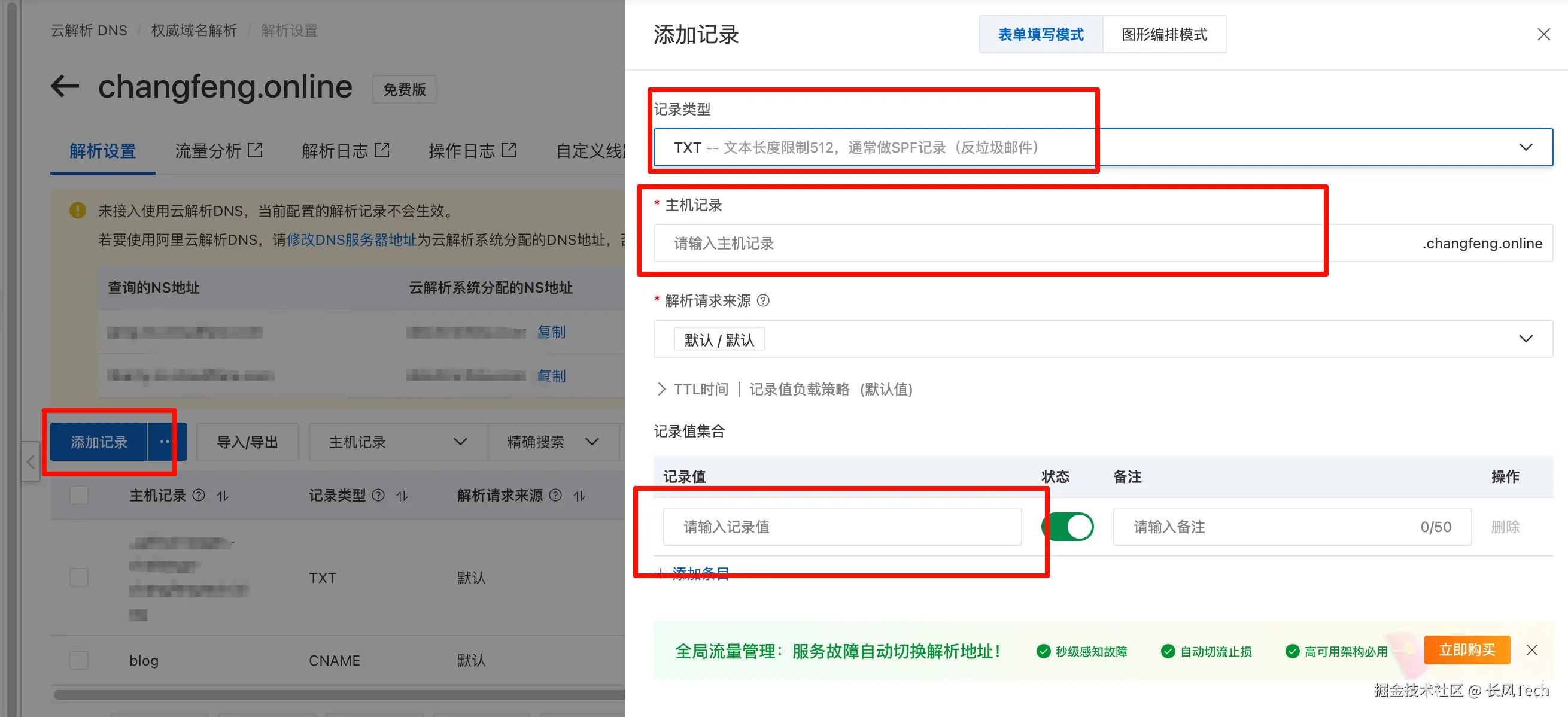 点击添加记录,记录类型选择TXT,然后将刚才复制的主机记录和记录值分别粘贴到对应位置,这样Github就可以验证我们的域名所有权了。