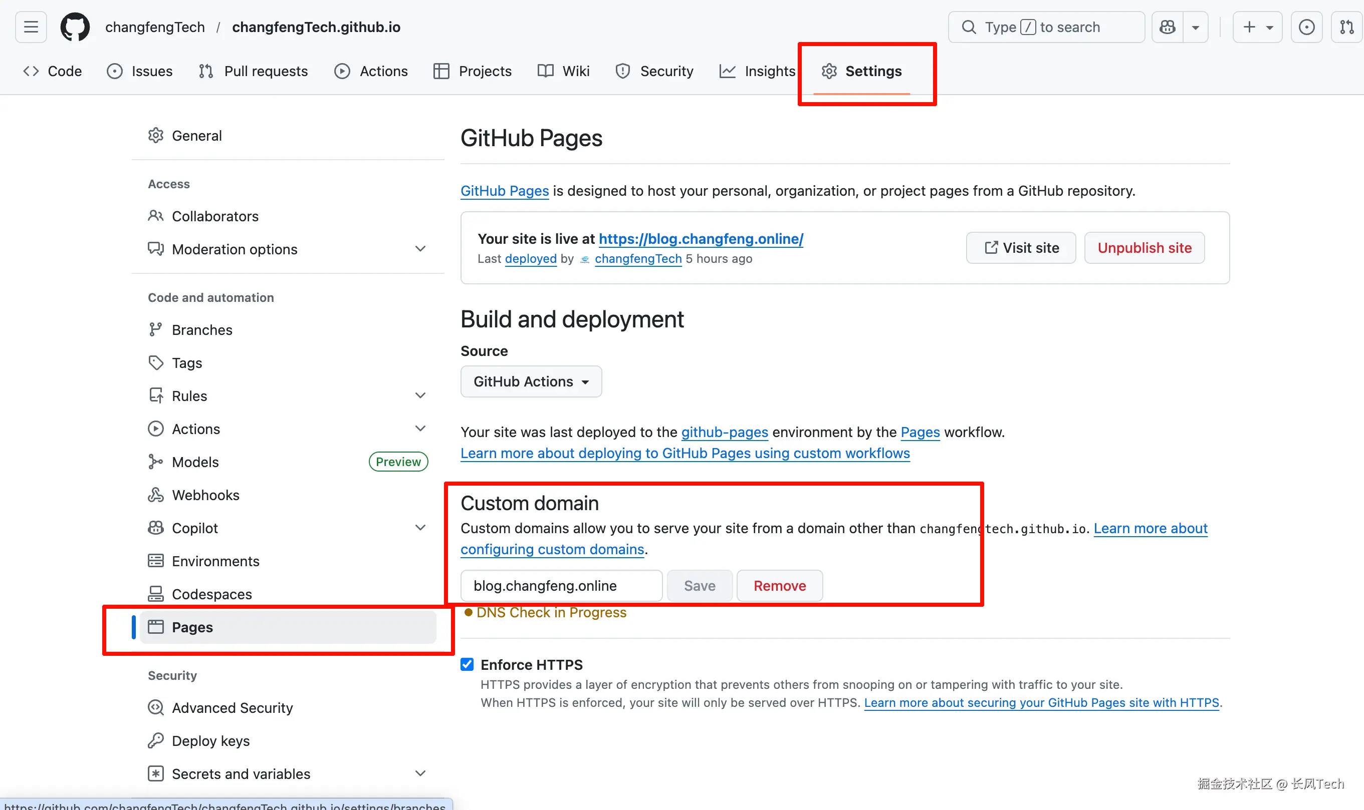 接着我们打开博客的仓库,进入仓库的Settings-Pages-Custom domain设置。(注意是仓库的,不是个人的,要和前面的步骤区分开)。
