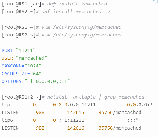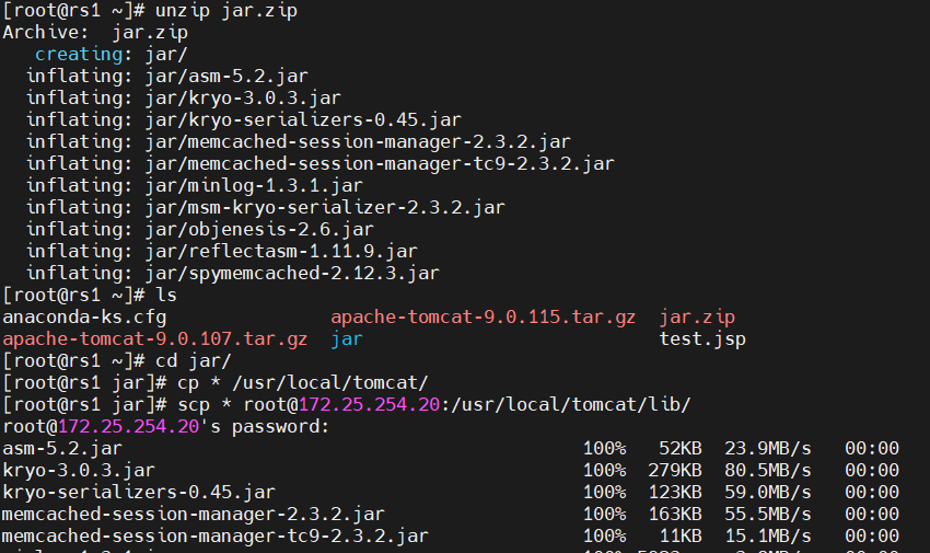 root@ng \~\]# nginx -s reload ### tomcat负载均衡   ## 四、tomcat+memcache实现session会话零丢失 ### tomcat加载模块 将事先准备好的jar压缩包解压  ### 在rs1、rs2主机都安装memcache  ### 配置tomcat