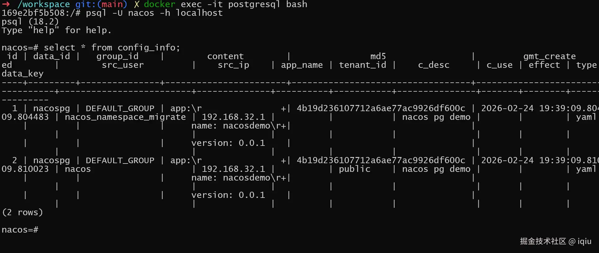 psql -U nacos -h localhost