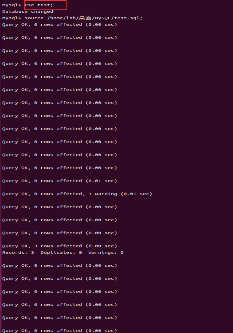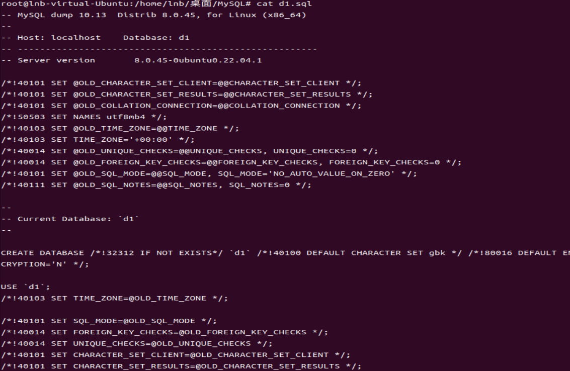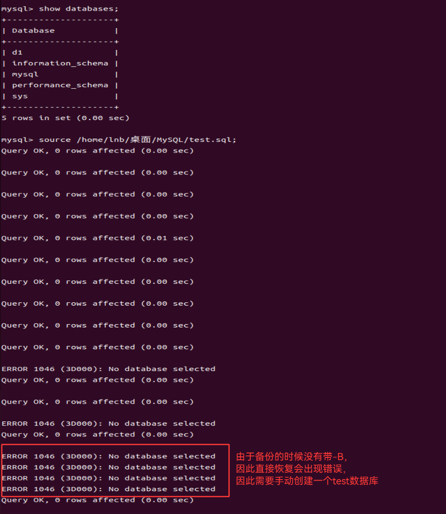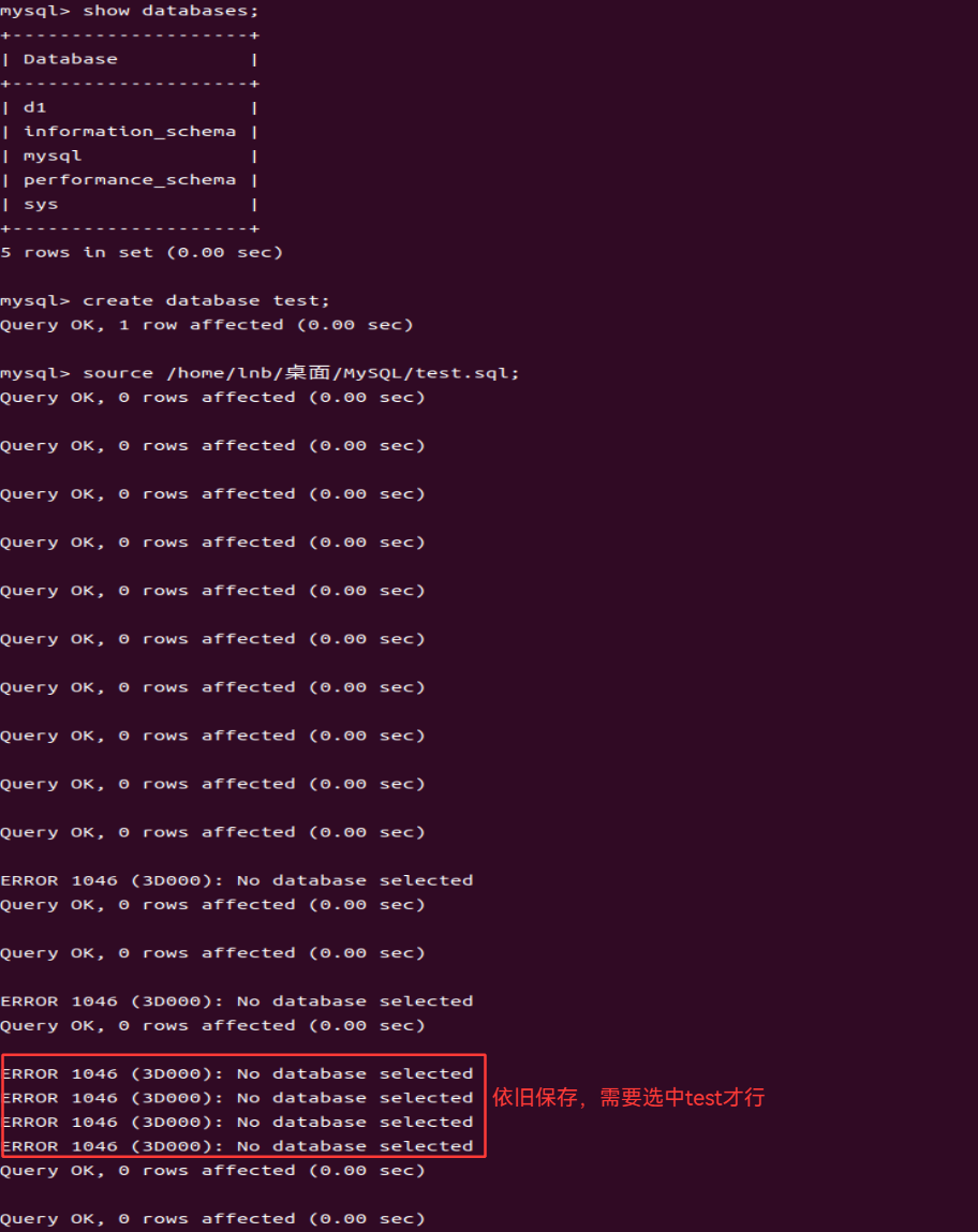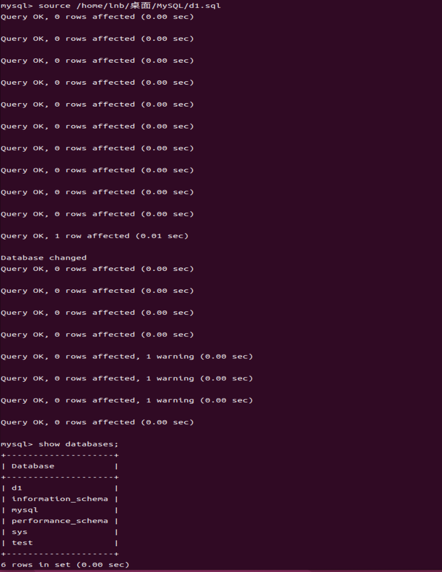 mysql> source /home/lnb/桌面/MySQL/d1.sql;