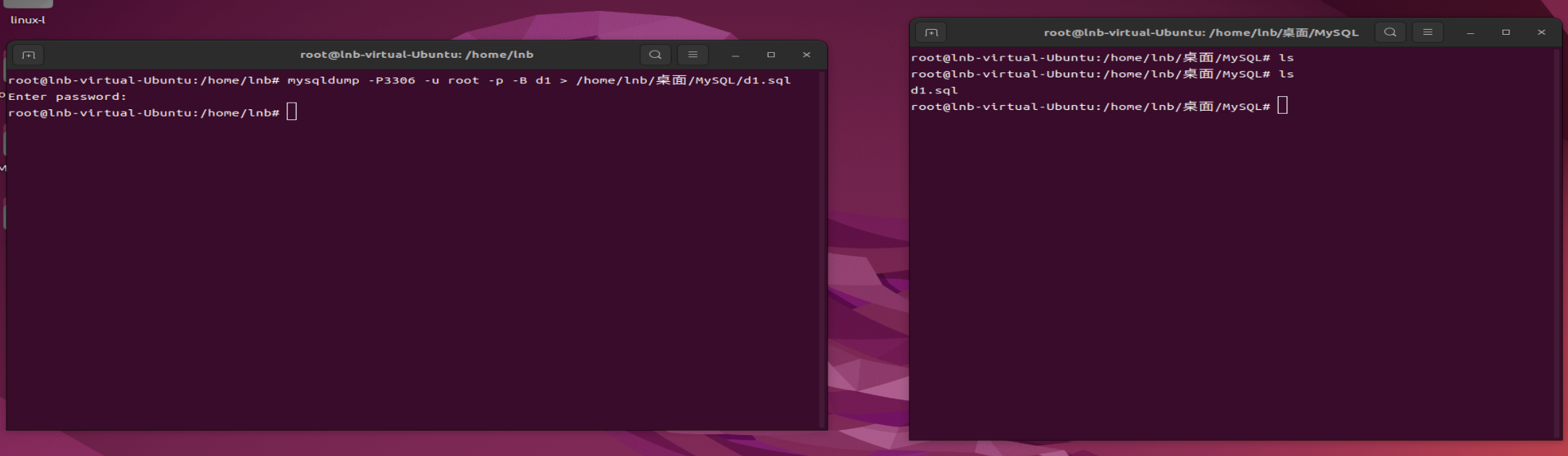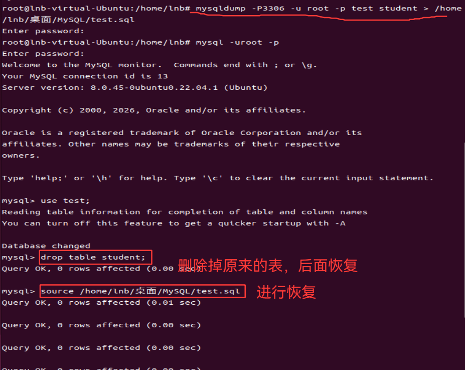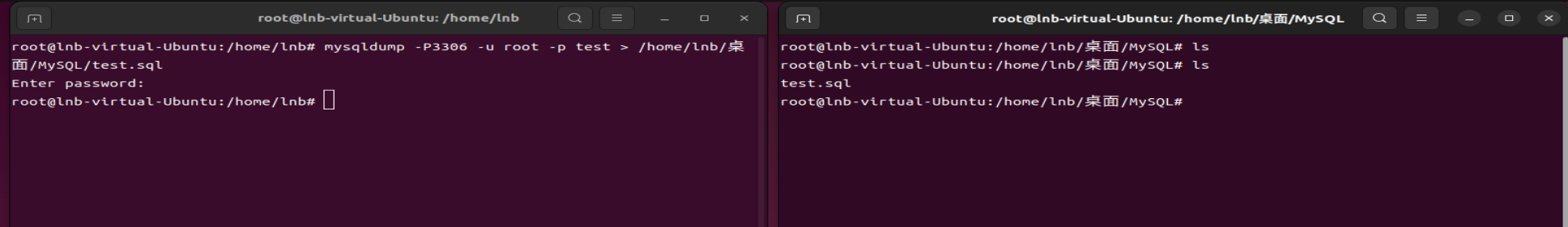 mysqldump -P3306 -u root -p test student > /home/lnb/桌面/MySQL/test.sql