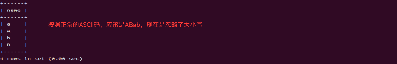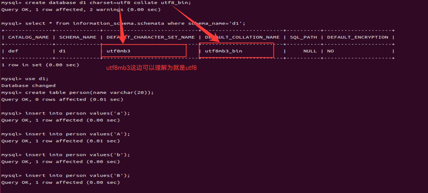 接下来来测试我们使用相同的字符集但不同的校验集会怎么样,校验集使用utf8_general_ci和utf8_bin,utf8_bin是区分字母大小写,而utf8_general_ci不区分,它也是我们默认使用的校验集。在以前的版本中会在对应的linux路径下有个.opt路径来查看当前数据库所设置的字符集和校验集,但是我这个是8.版本,只能使用命令查看。还有一点我们对数据库设置的校验集和字符集,表就会按照这个来。