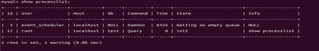 可以告诉我们当前有哪些用户连接到我们的MySQL,如果查出某个用户不是你正常登陆的,很有可能你的数据库被人入侵了。以后大家发现自己数据库比较慢时,可以用这个指令来查看数据库连接情况。