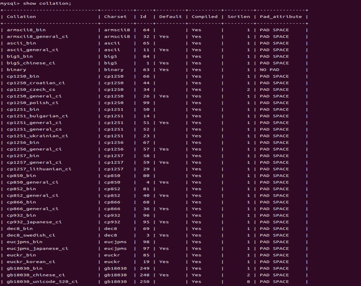 上面两命令是用来查是数据库支持的字符集和校验集,collation是校验集,charset是字符集