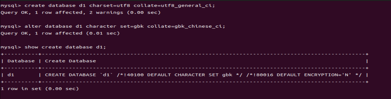 第一行命令就是创建库并设置它的字符集,第二行命令也是一样的,只不过不同的写法,第三行命令是同时设置字符集和校验集