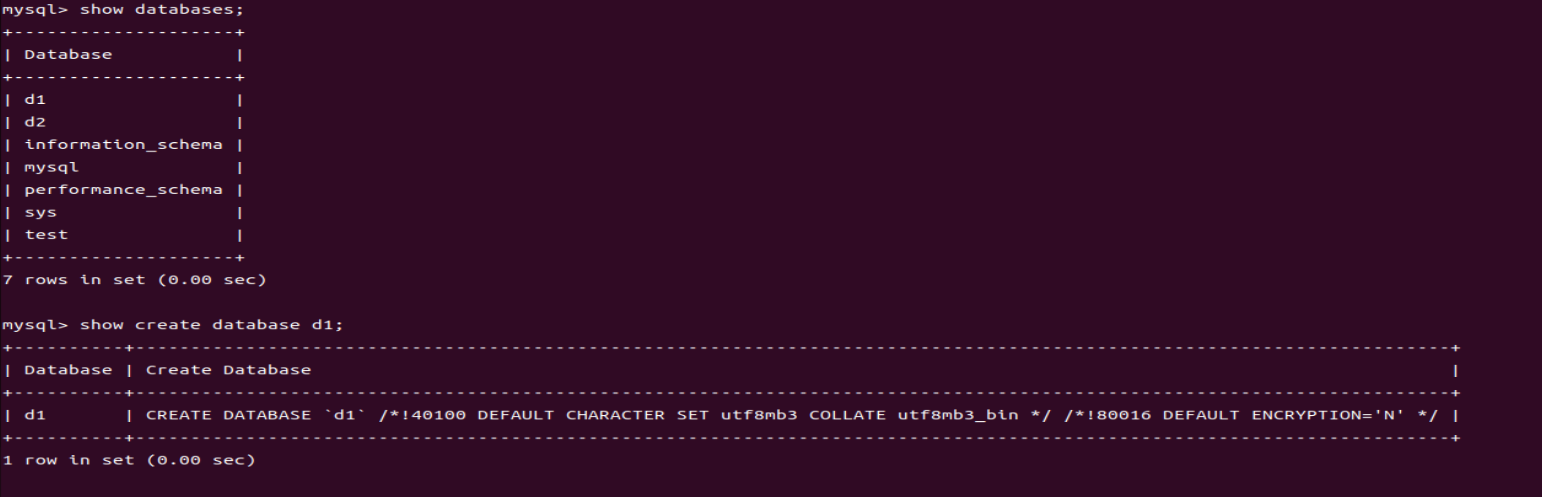 第一条命令不用解释大家也已经见到过好几次了,第二条命令是用来查看创建语句,数据库名字的反引号``,是为了防止使用的数据库名刚好是关键字