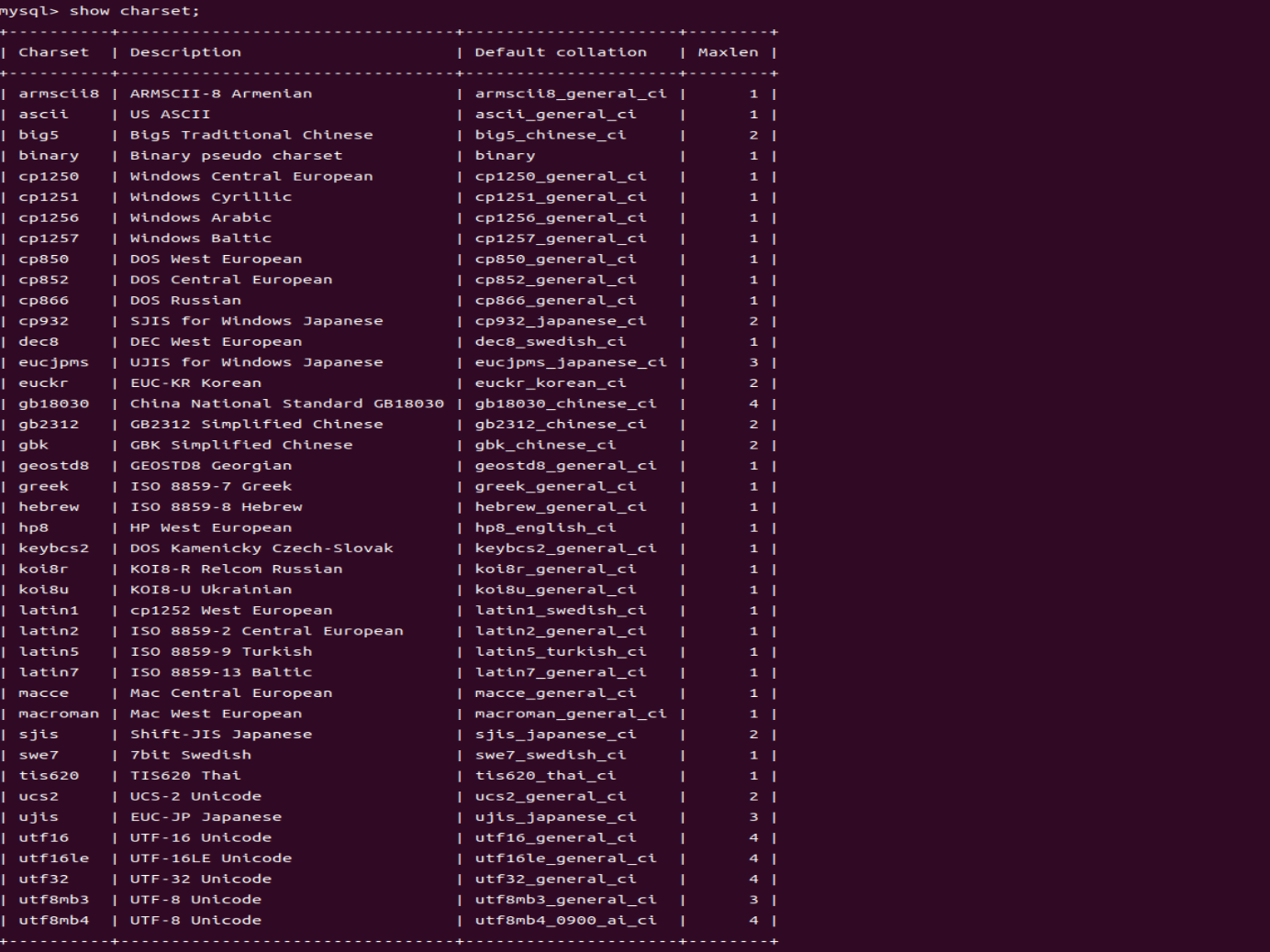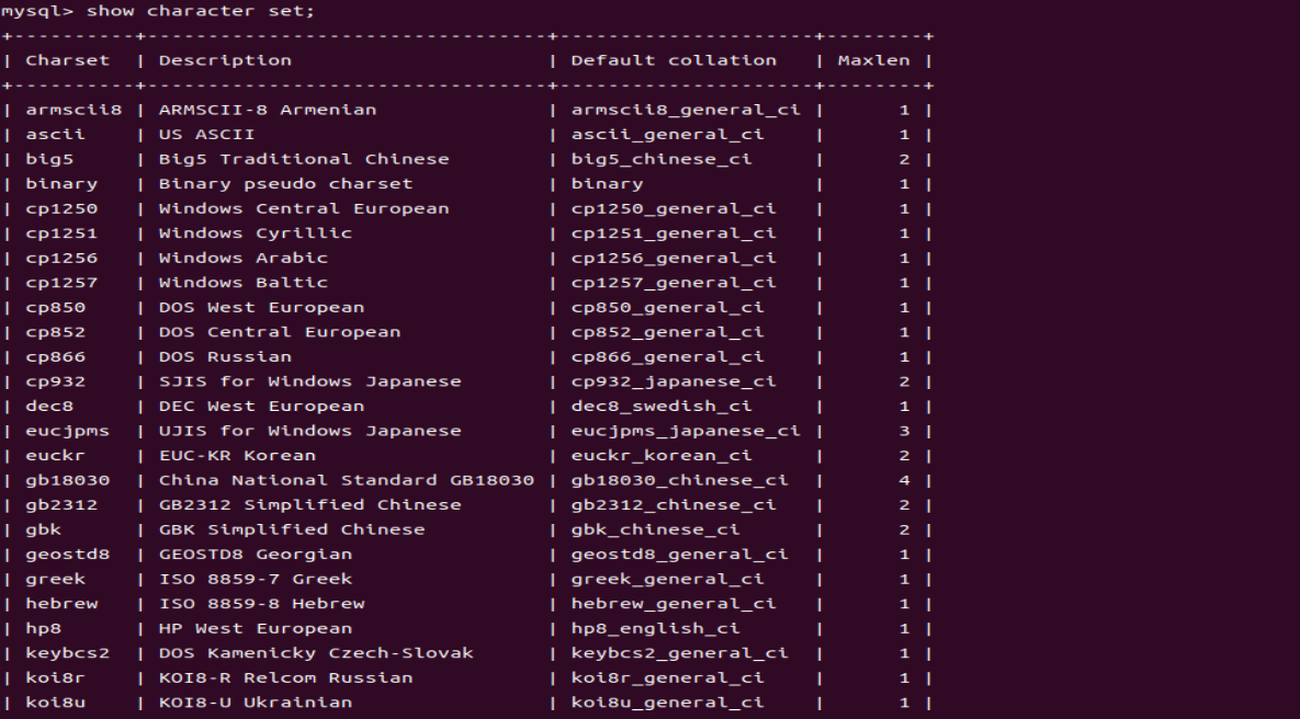 当然这条命令也可以查询字符集,它和charset是同一个意思