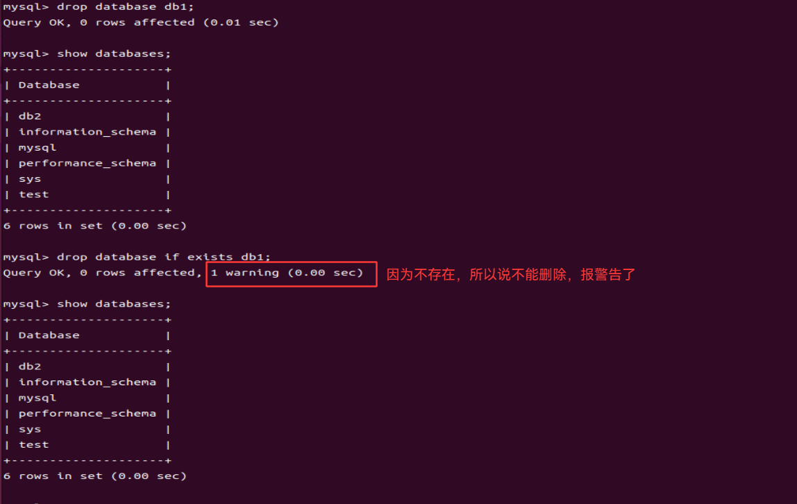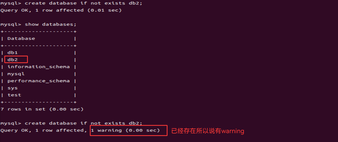 这个其实我们已经演示过了,但是这里再讲一下,并且还有一些增加的内容。第二条命令是当数据库不存在才会创建