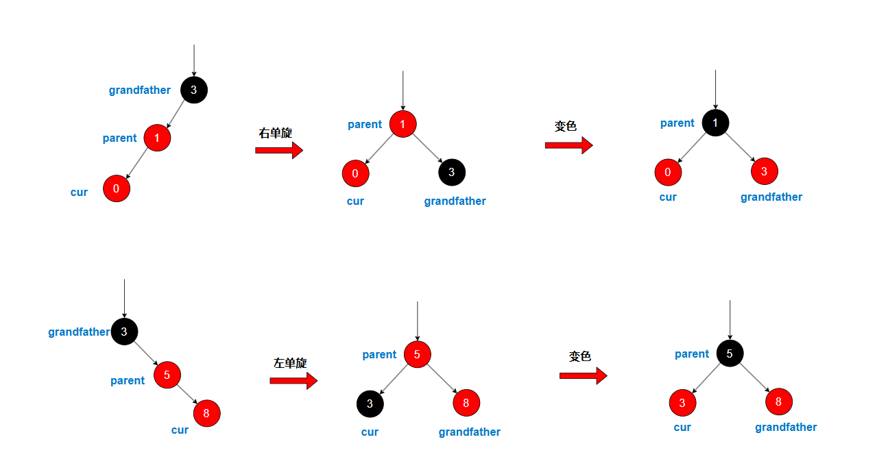 我们以grandfather为旋转点,进行单旋,**然后将parent变黑,grandfather变红,**整个结构满足红黑树性质,并且该部分的根已经变成黑色,无需继续向上调整,插入结束。