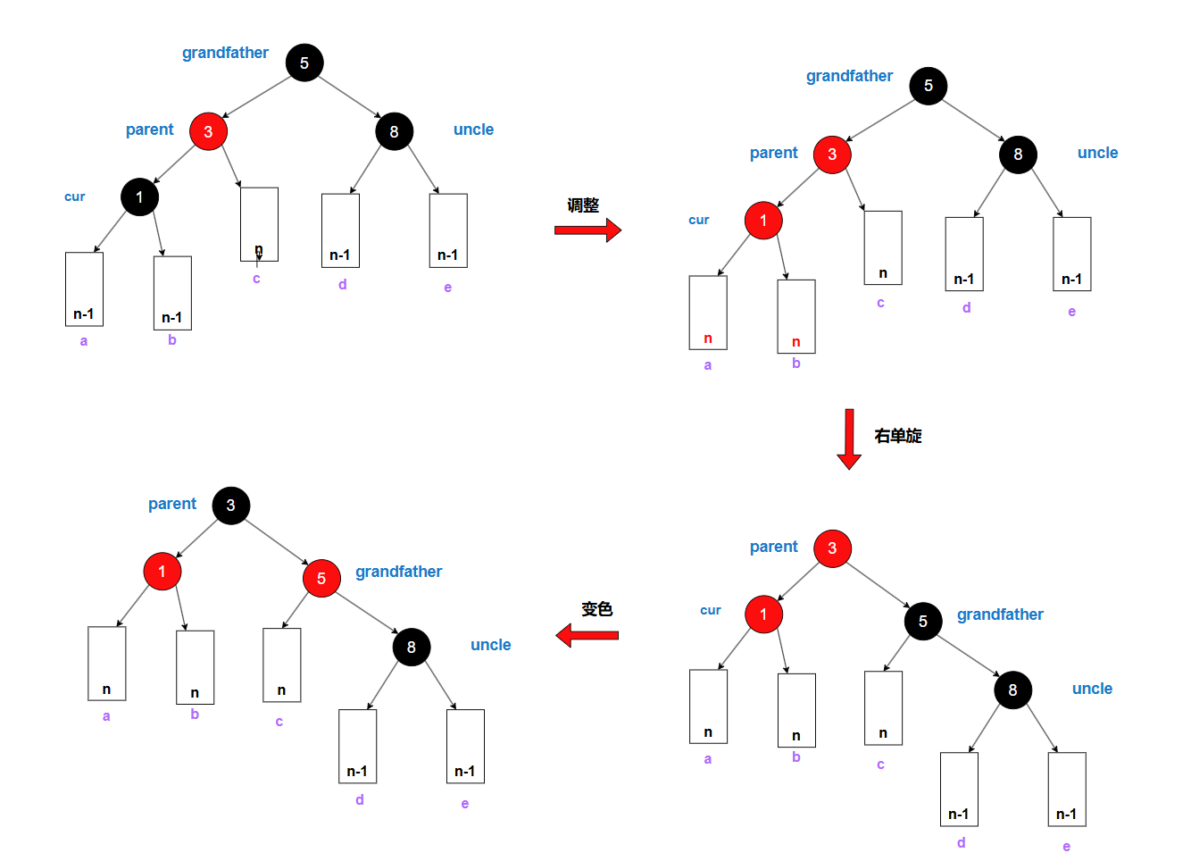 a,b,c,d,e表示路径黑节点个数,第一步到第二部是发生了变色,这时叔叔是黑色,就需要先旋转再变色了,**单旋完成后要将 parent 变黑,grandfather 变红;双旋完成后要将 cur 变黑,grandfather 变红。**操作结束后,该部分的根成为黑色,停止向上递归。