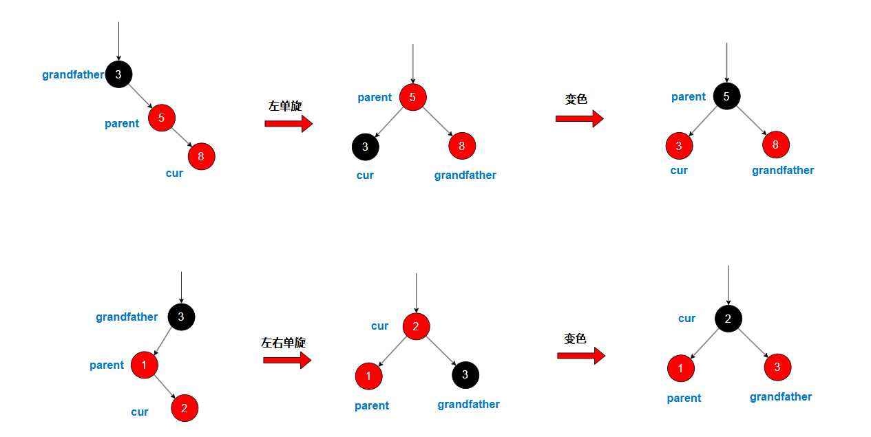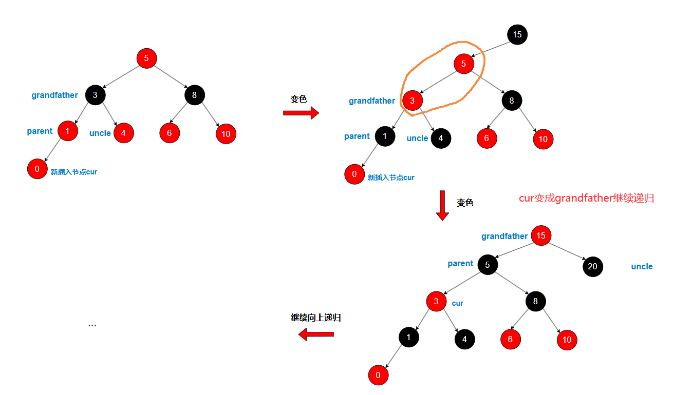grandfather变红后可能还会再次触发两个连续红节点,再次进行递归向上变色,直到根节点或者无连续的红节点停止。