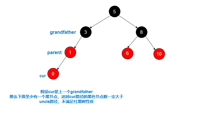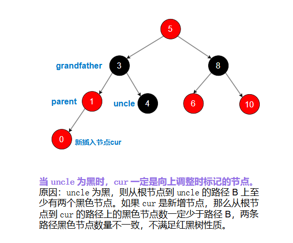 当 uncle 为存在且为黑时,cur 一定是向上调整时标记的节点。